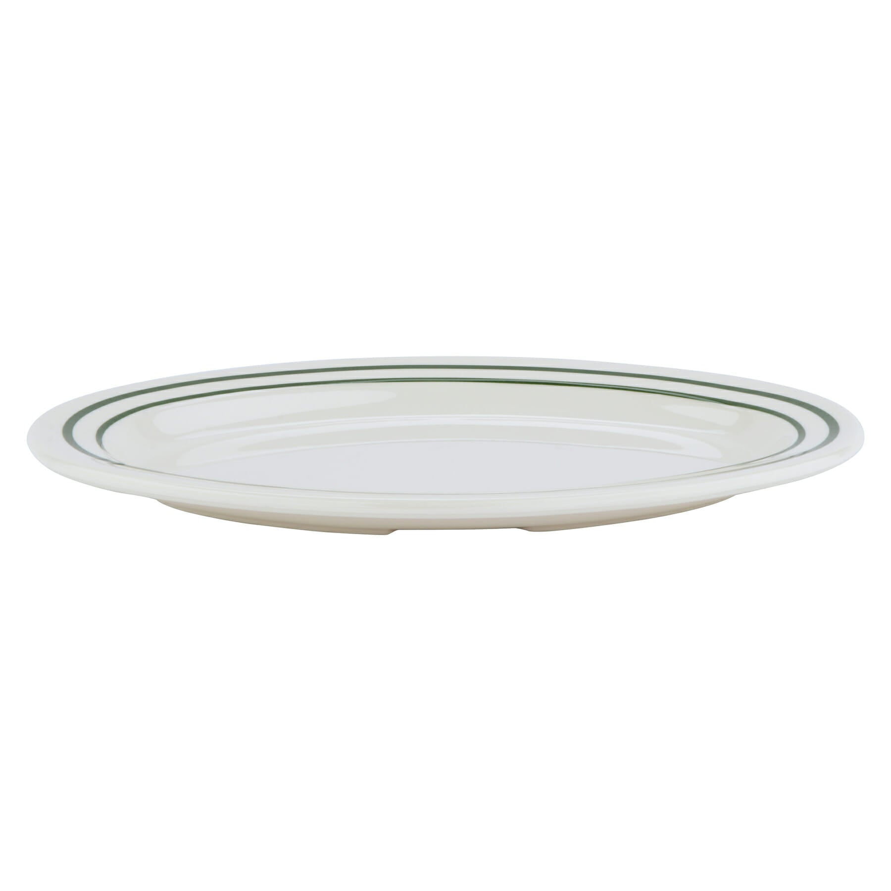 This historic pattern dates back to yesteryear but remains an ageless style even today. Classic dual green rim bands frame your delicious creations on the cozy cream plating area. Made from pure melamine, you benefit from vintage style with modern durability that outlasts porcelain 3:1.